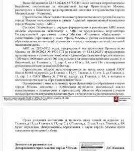 «В настоящее время Департаментом образования и науки города Москвы совместно с Комплексом проводится комплексный анализ существующих и планируемых к строительству объектов образования с учетом целесообразности сокращения дефицита мест и обновления имущественного фонда».