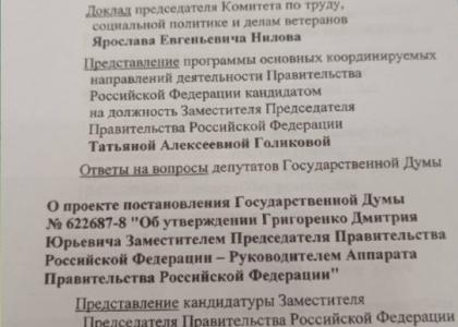 В начале обсудили кандидатуру Татьяны Голиковой на должность заместителя Председателя Правительства РФ.
