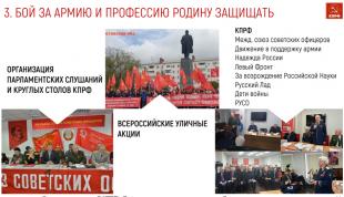 Более трех десятилетий всех нас объединяет общее дело и великая цель - возрождение своего Отечества как сильного суверенного социалистического государства. Партия развилась, возмужала и при поддержке народа способна ответить на любые вызовы и происки врагов. Анализ повесток общероссийских акций, проведенных КПРФ и ее Общероссийским Штабом протестного движения, подтверждает это. За два неполных года Общероссийский Штаб протестного движения, опираясь на региональные отделения и общественные организации, организовал 27 Всероссийских уличных акций, целый ряд научно-практических конференций и круглых столов.