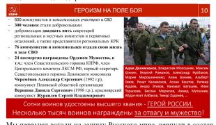 На полях военных сражений победа, безусловно, будет достигнута. Украинский нацизм будет посрамлен и разгромлен, ему не помогут никакие западные интервенции. В этом нет сомнения. Но сегодня ситуация требует от каждого из нас самого серьезного напряжения ума и сил по развороту политики страны на левые рельсы развития, преодолению в стране внутреннего кризиса. Большой и важной задачей партии сегодня является работа по развитию экономики, социальной сферы и системы безопасности, обеспечивающей суверенитет страны. КПРФ всегда была и остается организатором и лидером народно - патриотического движения. Она наследник и продолжатель достижений советской эпохи. За нами большая история и ответственность за будущее Отечества. Победа на фронте и левый поворот в политике - основополагающие факторы возрождения величия нашего Отечества. Когда весь русофобский мир сегодня ополчился против нас, затеяв войну не на жизнь, а на смерть, а Русь с её тысячелетней историей лишает права на существование, мы обязаны быть передовыми и сильными, уметь защитить себя. У нашей партии великая история и непобедимый характер. Мы первые били тревогу о необходимости восстановления триады, мы первые говорили о необходимости защиты оборонных предприятий. Большая заслуга в этом принадлежит депутату адмиралу Комоедову, а сейчас огромную работу проводят генералы Соболев, Бенов и другие. Но предстоящие преобразования в экономике настолько объемны и ответственны, что справиться с ними можно только объединяя и мобилизуя для победы все силы и средства, используя весь арсенал накопленного опыта и достижений социализма.
