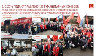 И тогда уже не случайны наши гуманитарные конвои, абсолютно не случайны наши коммунисты-добровольцы, наши первые секретари партийных ячеек, предельная геройская самоотдача и жертвенность солдат и командиров, когда на алтарь победы над врагом во имя Родины возносится цена собственной жизни. Наша партия и ее Общероссийский Штаб протестов продолжают гуманитарную миссию в Новороссии, внося достойный вклад в нашу общую победу. Исполнение гуманитарной миссии, помощь людям является важнейшим направление патриотической подвижнической работы нашей партии, За десять неполных лет КПРФ отправила в поддержку российских воинов и населения новых регионов России 125(сто двадцать пять) гуманитарных Конвоев с более 21тыс. тонн груза продовольствия, лекарств, медикаментов, военного снаряжения и оборудования. За пять месяцев текущего года партия уже передала в Донбасс груз 5-и гуманитарных конвоев. поднимая авторитет КПРФ и приближая будущую победу. В июне в зону боевых сражений уйдет очередной, 126-ой караван.