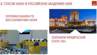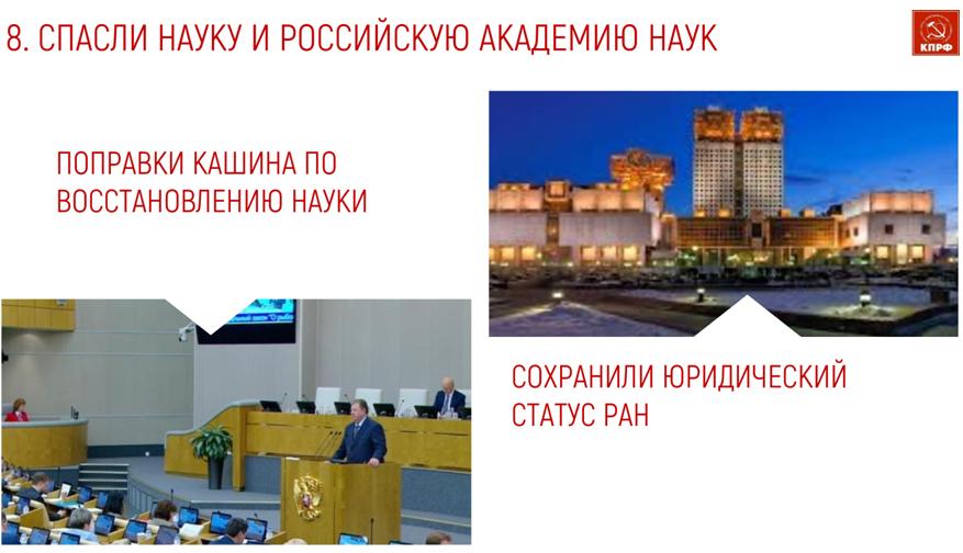 Сегодня на нас все еще продолжают работать достижения эпохи социализма. Если бы не советская наука, не было бы сегодня уникального вооружения, которым мы сегодня гордимся: знаменитых "Сарматов", «Кинжалов», и «Булав», многих других, еще более совершенных вооружений. Мы тогда внесли фракцией поправку, Борис Кашин, я, Иван Мельников, наш лидер Геннадий Андреевич Зюганов. И отстояли юридическую самостоятельность Академии! Теперь, во многом благодаря нашим поправкам в закон, Академия возвращается в фундаментальную и прикладную науку. Восстанавливается ее юридический статус, структура научных школ и институтов, базовые направления научной деятельности, экспертное величие и.т.д.
