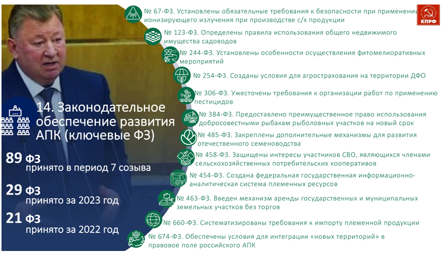 Во многом благодаря инициативе и подвижничеству нашей партии и разработан, принят на государственном уровне целый ряд целевых научно-производственных программ. Среди них: «Комплексное развитие сельских территорий», «Вторая Целина», программы развития сельского хозяйства и продовольственных рынков и всё, что связано с научно-технической проблематикой. Эти наши программы работают даже, несмотря на существующие проблемы и явное недофинансирование их со стороны финансового блока Правительства.