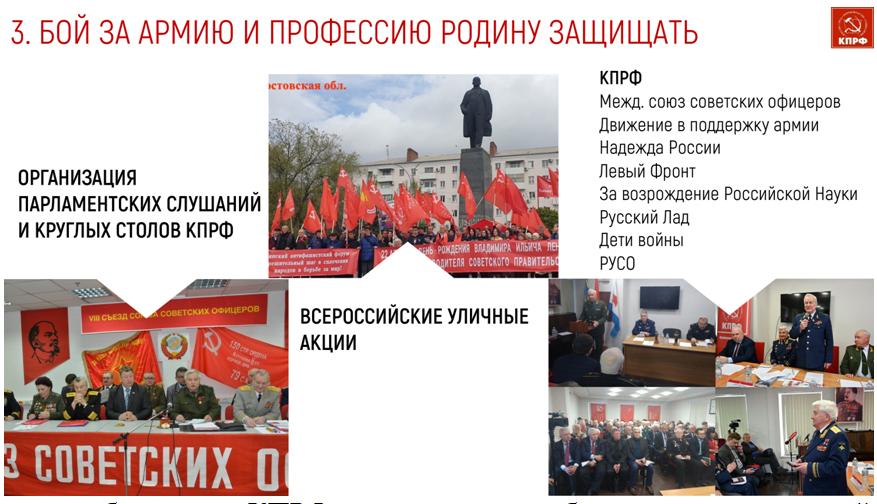 Во многом благодаря КПРФ в стране все же был сохранен мощный военный потенциал, доставшийся в наследие от СССР и остановлен процесс развала Вооруженных Сил многие годы обеспечивающих безопасность государства.