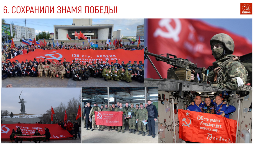 Для наших воинов Красное Знамя олицетворяет победную связь поколений и несокрушимость Отечества, дороже которых ничего нет. Солдаты считают, что оно, как защитный оберег, спасает их от пуль и снарядов противника, Но был период, когда нашей партии пришлось защищать само Знамя Победы. Тогда провокаторы пятой колонны, понукаемые спонсорами из США, предприняли попытку обезглавить наш священный символ, убрав с полотнища пятиконечную звезду, серп и молот, разорвав этим связь эпох и поколений. Готовился прямой вызов советской эпохе, памяти павших и бессмертному подвигу нашего народа. Мы не позволили этим русофобам и антисоветчикам глумиться над национальной святыней, хотя Совет Федерации и «Единая Россия» с генералом Сигуткиным проголосовали «за». Голос протеста коммунистов, ветеранов и героев войны, депутатов, заслуженных граждан услышала и поддержала вся страна. Президент, видя такое единение, принял нашу сторону, поддержал нас. Отстояв национальный символ, мы с вами сделали большое дело для страны, для будущих наших поколений. Сегодня Знамя Победы вновь работает на Россию, вдохновляя бойцов на подвиги во имя Отечества. С ним сегодня идут в бой молодые воины - наследники славы 45-го. Красное Знамя великих побед развивается на башнях танков и стратегических высотах, освобожденных от врага.