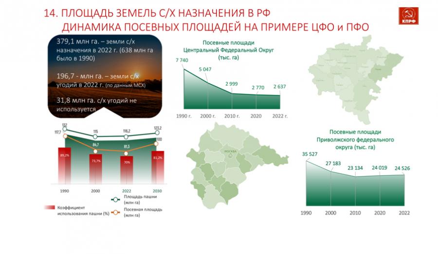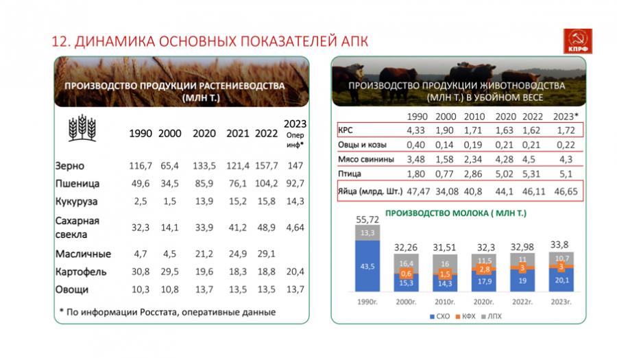 Развитие агропромышленного производственного комплекса и возрождение нашего села являются важнейшим направлением работы нашей партии, которым она сегодня целенаправленно и ежедневно занимается. В Государственном агропромышленном комплексе, во многом благодаря нашим предложениям, сегодня работает уже пять комплексных Программ. Концентрация нашего внимания именно на этом направлении закономерна. Сегодня только в личном подсобном хозяйстве зоны агропромышленного комплекса страны занято более 16 миллионов человек. А, кроме того, 6,9 миллиона человек занято в крупном, среднем и малом бизнесе. При этом, если учитывать и дачные участки, где летом по 7—8 месяцев живет 90 миллионов человек, то важность и глобальность стоящей задачи трудно переоценить.