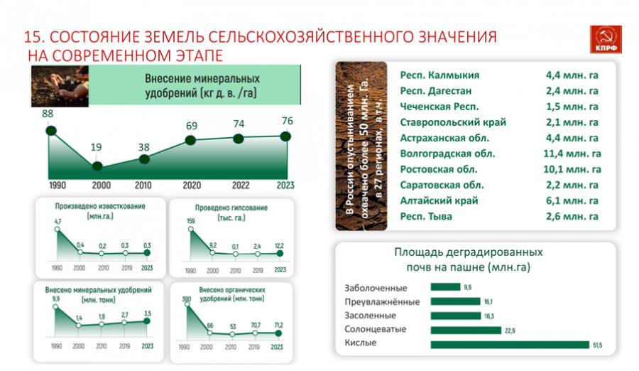 Уважаемые друзья! Все мы должны ясно понимать огромную стратегическую значимость программы второй целины, восстановления заброшенных земель для становления Российского государства. Мы сегодня работаем в парадигме: 70 лет большой целины, 50 лет известного постановления ЦК по Нечернозёмной зоне, и снова мы, и снова только фракция КПРФ, поднимает эти вопросы на уровень первых руководителей государства. Не хватает государственного подхода и воли, к сожалению, у многих людей понимать и видеть будущий результат реализации программ. Им незнаком порыв советского народа, когда миллионы людей ехали поднимать целинные залежи, считая своим долгом и честью труд во славу Отечества. После войны годы были сложные, страна нуждалась в продовольствии и тогда в короткий срок дополнительно(!) было произведено 54 млн. тонн зерна. Мало распахать залежи, надо далее работать через коренное улучшение земли, через мелиорацию, через систему обеспечения почвы в балансе питательными веществами и всего остального. Необходимо убирать лимитирующие факторы, которые ограничивают потенциал новых сортов и растений, созданных отечественными селекционерами, и получать полтора-два урожая в год. Мы сегодня эту идею вдалбливаем в головы тех, кто руководит наукой и производством. Все это мы уже проверили на практике, не только в отдельных хозяйствах, но и в масштабе площадей целых районов.