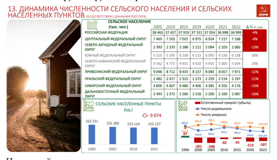 Не случайно, параллельно с развитием производства, партия настаивает на реализации комплексной программы возрождения русской деревни, развития сельских территорий. Ведь село – это 25% от всего населения страны, а 60% боевого состава Армии, воюющей сегодня на СВО, сформировано за счет трудоспособного сельского населения. Вот где истоки и родники патриотизма! Там и любовь к Родине другая, чистая и искренняя. В деревне и люди живут по-другому, там каждый друг друга знает, друг друга видит и друг другу помогает.. Это община, которую не разорили ещё наши недруги, включая пятую колонну.