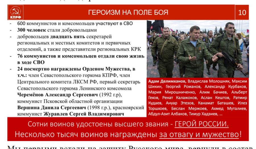 Впереди огромный пласт работы, в центре которого сентябрьские выборы и 80-летие Великой Победы. В период войны все мы, отвечая за положение дел в своих регионах, обязаны объединить и мобилизовать патриотические силы общества на новые свершения. Важно максимально вовлечь в эту работу молодёжь, трудовые коллективы, ветеранов. Приходу этих важных для страны событий должна предшествовать массовая разъяснительная работа с населением. Обществу необходимо напомнить о роли коммунистической партии в Великой Победе. Необходимо добиться, чтобы после участия в наших патриотических массовых акций молодые люди осознаннее, без перекосов воспринимали историю наших братских народов и свою ответственность за судьбу страны.