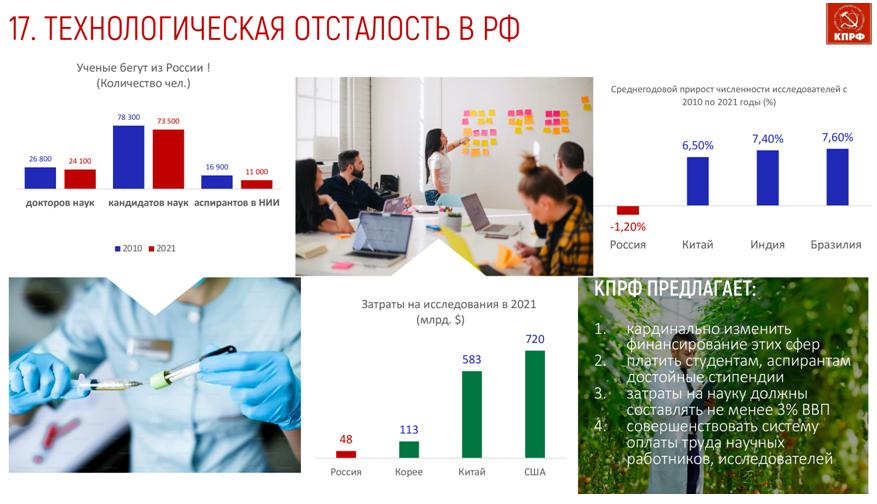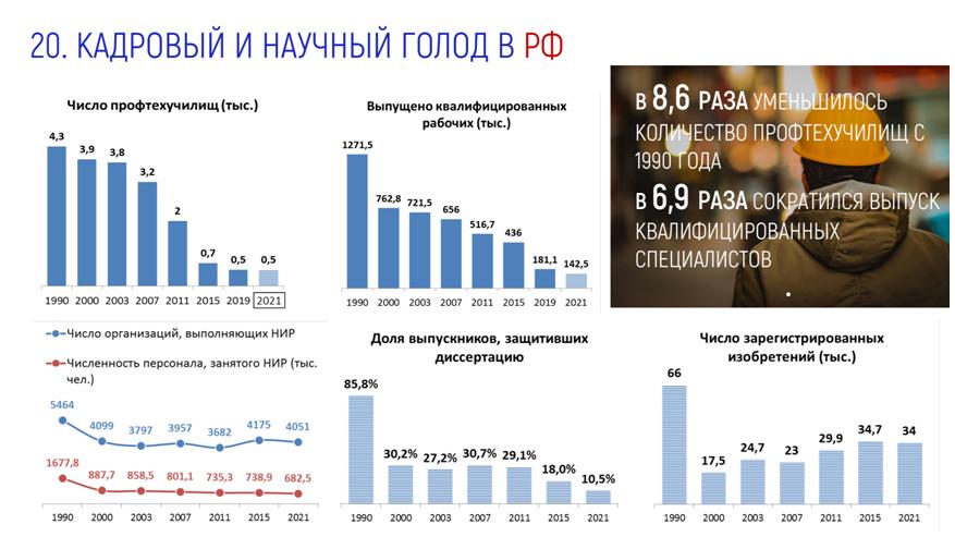 Мы сегодня в десятки раз меньше выделяем средств на науку, по сравнению с Америкой и Китаем. Бюджетное финансирование и объем научных исследований в мире ежегодно увеличивается высокими темпами, а у нас снижается. Если исключить оборонный комплекс серьёзное отставание наблюдается в области промышленных технологий.