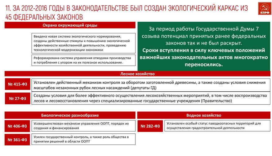 Депутатской фракции КПРФ принадлежит авторство десятков законов только лишь на лесном направлении. Речь идет о сохранении леса, запрета на его передачу в частную собственность, о восстановлении лесхозов. Они спасают русское поле, лес, и статус страны, как одной из самых могучих лесных держав. К законам по защите лесов теперь добавляем блок экономического содержания. В этом нас поддерживает Президент. Несмотря на то, что у нас много бардака здесь, но динамика есть. Это дорогого стоит, поскольку лес - это богатство страны, это лёгкие мира. Если бы не встали тогда мы вместе с наукой, с учёными, с лесниками за наш русский лес, было бы хуже. Точно так же в экологии