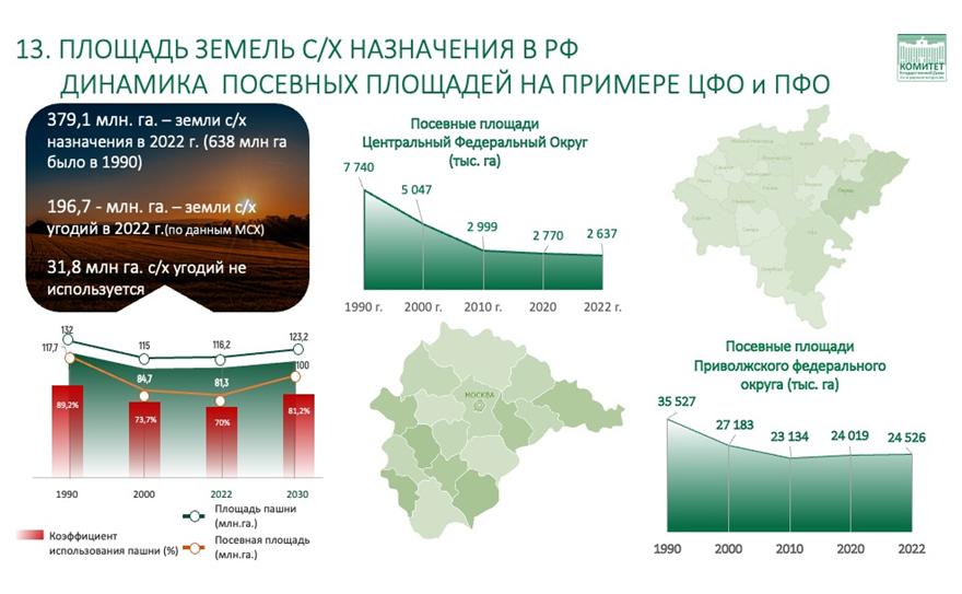 Мы исходим из понимания, что наша продукция нужна, а она действительно нужна, потому что миллиарды людей сегодня хотят куска лишнего хлеба и стакана чистой воды, а у нас все как раз есть. У нас есть возможность ввести в севооборот дополнительно десятки миллионов гектар. Умножим хотя бы на 30 центнеров, это сразу 30 миллионов, только если 10 гектар. А у нас возможность такая есть, мы сегодня 81 миллион имеем в севообороте, совсем недавно имели 117, то есть нам надо подходить к 30-м году к 100 миллионам.
