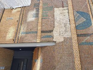 Недавно, из-за ненадлежащего ухода и отсутствия реставрации часть мозаики осыпалась, создав нелицеприятную плешь на фасаде дома.