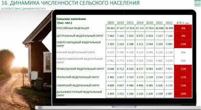 Слушайте, если бы мы повысили результат работ в 3-4 раза, я убежден, что мы бы сократили отток населения. И каждый фермер, который работает, он не покупал бы квартиры для своих детей в областном центре и в Москве, а, может быть, если хорошие условия жизни создали на селе, и подумал бы, почему не жить здесь, т.к. есть и горячая вода, и транспортная доступность, и все остальное, хорошие детские сады и так далее. Вот никак до конца не пробьем и не уговорим те министерства, которые не могут эти там 150 миллиардов в год найти для решения огромной задачи сохранения пространственных связей. Сегодня 25% живущих на селе сформировали 60% бойцов в СВО. Тут истоки, родники, патриотизм и все остальное на чем держится держава.