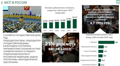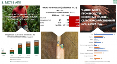 В этой связи важно отметить, что в ведущих экономиках мира малый бизнес имеет вклад в валовую продукцию около 50%, а в отдельных странах гораздо больше. Мы на сегодняшний день имеем 21% в ВВП, а в АПК - 40%.