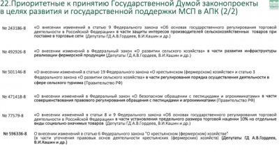 Что касается наценки, второй закон. Тоже два года прошло. Вот сейчас в другом комитете он идет, я там два часа докладывал. Даже торговые сети уже согласны иметь торговую наценку 10%. Правительство дало нам отрицательный отзыв. Но, слава богу, Президент дал соответствующее поручение и этот отрицательный отзыв пока подвис. Элементарные вещи, которые дали бы нам возможность серьезно распределять тот доход, который создают крестьяне. Это большая работа, за справедливость ко всему крестьянству, которое создает с/х продукцию