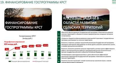 Мы с Александром Владимировичем Двойных постоянно работаем над этим вместе с министерством, думаем, анализируем, работаем над многими другими вопросами, которые связаны с улучшением жизненных условий сельского населения. Нам вместе удалось принять Государственные программы по комплексному развитию сельских территорий. По исходному паспорту 200 миллиардов рублей в год заложено. Мы работаем по программе четыре года, в течение которых уже много сделано благодаря нашей активной позиции. Оксана Николаевна сама вела эту программу, работая еще первым заместителем министра. Но нам на программу максимально выделяли около 60 млрд руб. Для сравнения 200 млрд руб и 63.