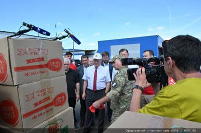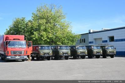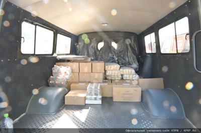 В составе гуманитарной миссии КПРФ в этот раз отправляется и большая колонна спец автомашин УАЗ и мотоциклов. В гуманитарном грузе в большом количестве переданы: мясные, рыбные и овощные консервы, лапша быстрого приготовления, макаронные изделия, печенье, сахар, сгущенное молоко, вода, чай, бакалея, средства личной гигиены, лекарства, бинты, сети и многое другое.