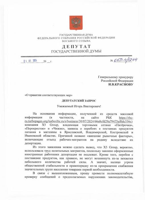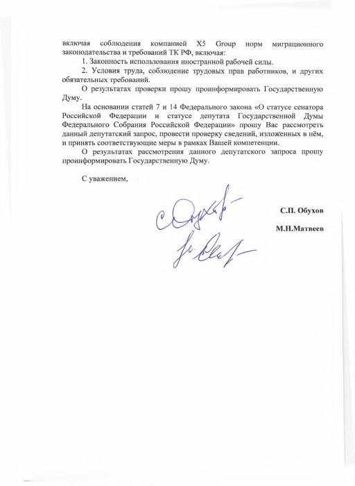 Поэтому депутаты-коммунисты попросили в запросе Генеральному прокурору «провести полномасштабную проверку сообщений о предполагаемых нарушениях законодательства, включая соблюдения компанией Х5 Group норм миграционного законодательства и требований ТК РФ, включая: