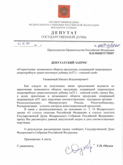 Поэтому отправил премьер-министру Мишустину новый запрос с предложением в целях пресечения и незаконного оборота продукции содержащей запрещенную мТГ дать поручение соответствующим надзорным органам - Россельхознадзору, Минпромторгу России, Роспотребнадзору, Росакредитации - усилить контроль животноводческой продукции.