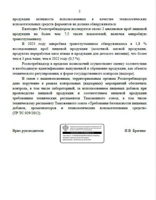 В ответе, в частности, говорится: «Ежегодно Роспотребнадзором исследуется около 2 миллионов проб пищевой продукции на более чем 7,5 тысяч показателей, включая микробную трансглутаминазу. В 2023 году микробная трансглутаминаза обнаруживалась в 1,8 % исследованных проб пищевой продукции (молочной, мясной продукции, продуктах переработки мяса птицы и продукции для детского питания), что более чем в 3 раза чаще, чем в 2022 году (0,5 %)».