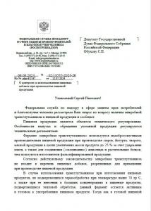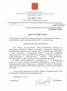 В ответ на первую серию моих депутатских запросов получил предложение от Россельхознадзора: «При наличии соответствующего правительственного поручения в целях пресечения и незаконного оборота продукции содержащей запрещенную мТГ Россельхознадзор выражает готовность по усилению контроля животноводческой продукции».
