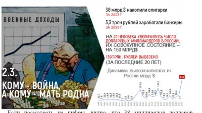 Если посмотреть на цифры, видно, что 38 миллиардов долларов получили олигархи за 23-й год. Появились даже 22 новых миллиардера. Получили, но не вложили в Россию, а наоборот, за 22-й год 240 миллиардов долларов вывезли из страны. Умножьте на сегодняшний курс, сколько это будет триллионов. И это происходит во время войны. Вопрос, какая партия, имея парламентское большинство, в первую очередь несет ответственность за то, что происходит.
