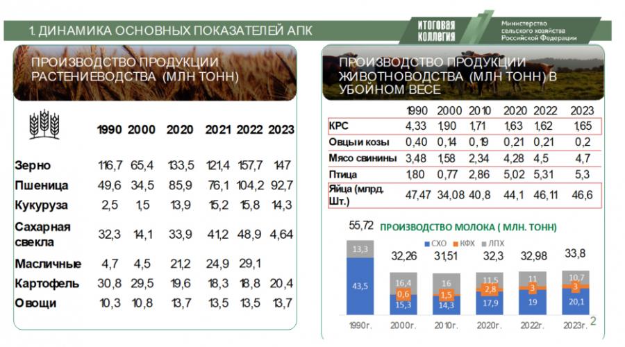 Уважаемые товарищи! Я также присоединяюсь к добрым словам в адрес тружеников агропромышленного комплекса, которые внесли неоценимый вклад в результаты 2023 года. Мы все понимаем, что это был непростой год, особенно в экономическом плане. Тем не менее, благодаря вашему труду, удалось достичь впечатляющих результатов — урожай зерновых и зернобобовых составил 147 миллионов тонн, что является значительным показателем для нашей страны.