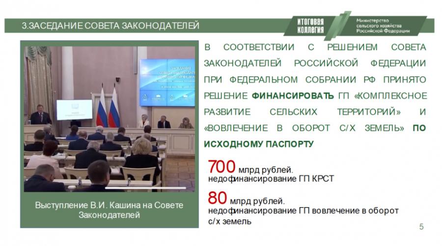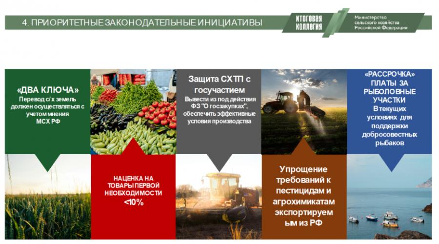 В целом ещё раз, уважаемые товарищи, хочу нас поздравить с этим большим мероприятием, итоговой коллегией, и пожелать в этом году, несмотря ни на что, в году, в котором, я убеждён, мы много сделаем и на фронтах для победы, но и здесь с первого дня мы с вами работаем под девизом “Ни шагу назад”. Давайте покажем свой крестьянский характер, всё уберём.