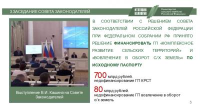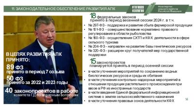 Из 89 законов, которые мы приняли в седьмую сессию и 50 законов, которые мы приняли за эти два года, не считая 24-й год, все законы сутевые. Они выстроили вертикаль управления и контроля в племенном животноводстве, семеноводстве, в землепользовании, ветеринарии, страховании. Обеспечивают законодательную поддержку госпрограмм в АПК и производителей всех форм хозяйствования и форм собственности.