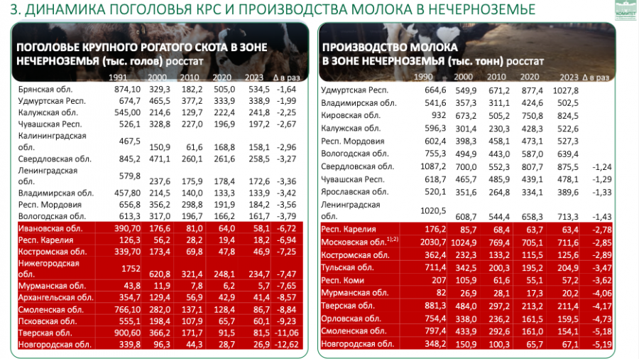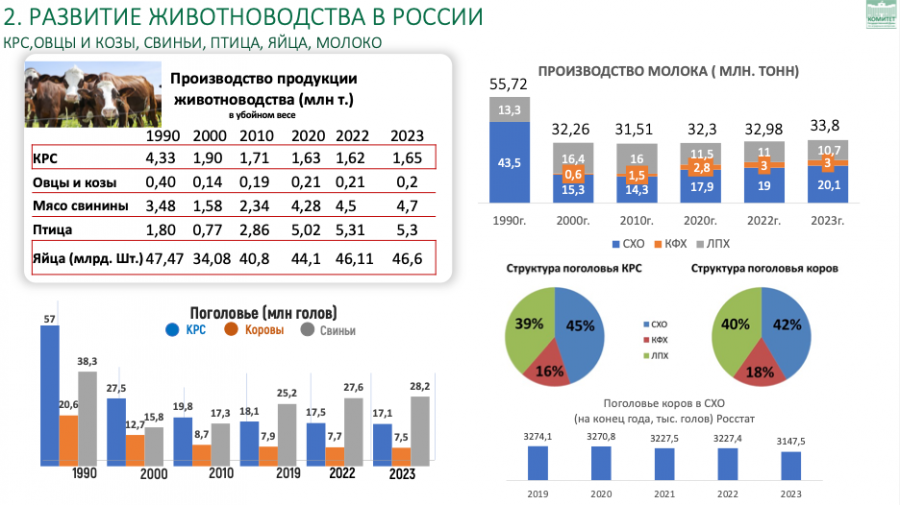 Одной из наиболее серьезных проблем, с которой сталкивается отрасль, является сокращение поголовья дойного стада. Если сравнить 2020 год с текущим, становится очевидно, что мы потеряли еще 123 тысячи коров в сельскохозяйственных организациях. Это тревожная тенденция, особенно если учесть, что за последние 15 лет в личных подсобных хозяйствах убыли 6 миллионов голов КРС.