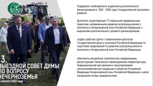 Посмотрите на Нечерноземную зону. Был выездной Совет Думы в Тверской области по вопросу Нечерноземья, принявший соответствующие решение. Это уникальная зона, которая когда-то производила 33% всего российского молока, а также другую продукцию — картофель, овощи и прочее. Сегодня мы видим огромные резервы.
