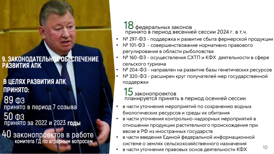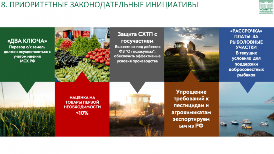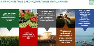 Что касается приоритетных законодательных инициатив, которые обсуждались на итоговой коллегии вы можете увидеть на слайде ниже . Во-первых, система «Два ключа» — перевод сельскохозяйственных земель должен осуществляться с обязательным учётом мнения Министерства сельского хозяйства РФ, что позволит контролировать сохранность земельных ресурсов и предотвратить их нецелевое использование.