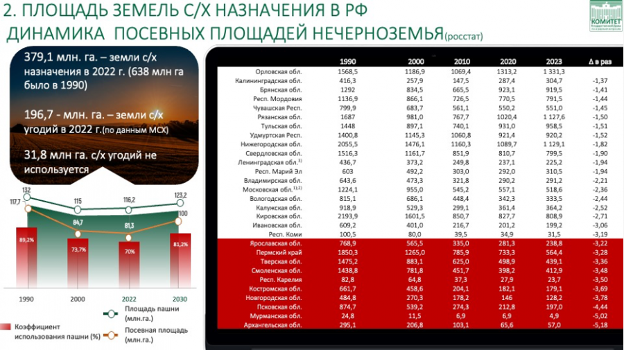 Вот несколько слайдов: некоторые области сократили здесь поголовье крупного рогатого скота в 12 раз, что касается посевных площадей с в ряде регионов осталось лишь 25% от прежних. Поэтому и было принято решение, и вся Дума выехала в Тверскую область во главе с Председателем ГД. Все фракции там присутствовали, и было принято соответствующее решение. Доклады делали и я, и Патрушев. Решение оформлено отдельным постановлением ГД.