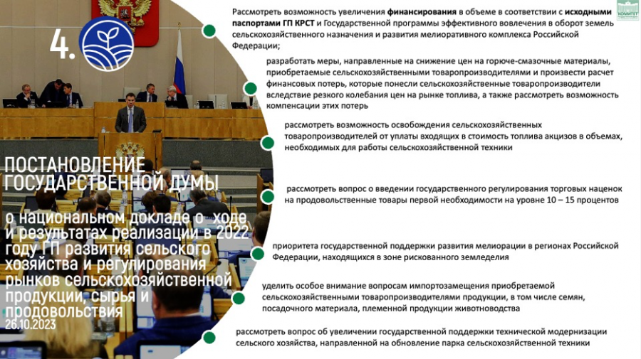 Далее в 20-х числах сентября Дмитрий Николаевич Патрушев делает национальный доклад на палате ГД, после чего снова принимается постановление. Я специально показываю на слайдах основные пункты этих постановлений.