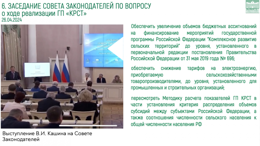 Совет законодателей также принял решение с участием Председателей Госдумы и Совета Федерации, после моего доклада по вопросу о ходе реализации государственной программы РФ "Комплексное развитие сельских территорий" в части комплексного развития инфраструктуры сельских населенных пунктов, а также Государственной программы эффективного вовлечения в оборот земель сельскохозяйственного назначения.