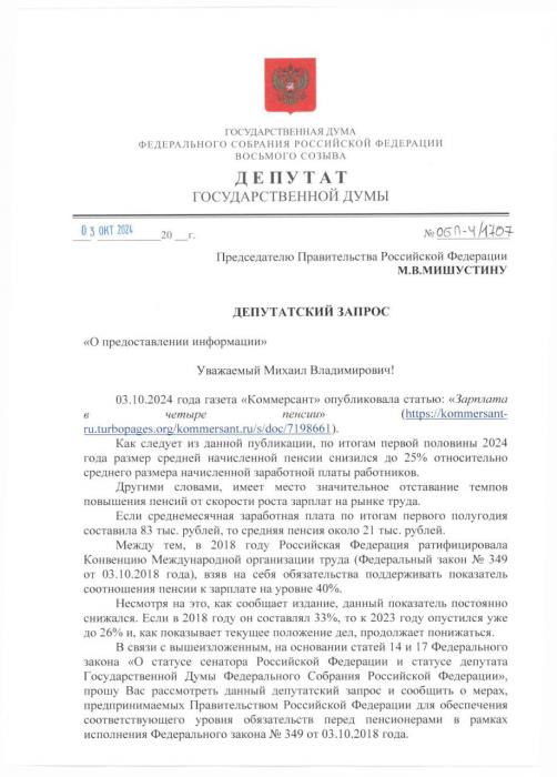 В связи с этим, как депутат ГД, направил запрос премьер-министру Михаилу Мишустину, в котором задал вопрос о том, когда Правительство Российской Федерации планирует достичь соотношения средней пенсии к средней заработной плате в размере 40% от уровня последней?