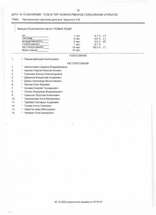 Помимо «Единой России» принятие антикоррупционного протокольного поручения заблокировали представители партии «Новые люди» (14 из 15 депутатов), а также ЛДПР (все 22 депутата фракции не голосовали) и представители «Справедливой России – Патриоты – За правду» (не голосовало 5 из 28).