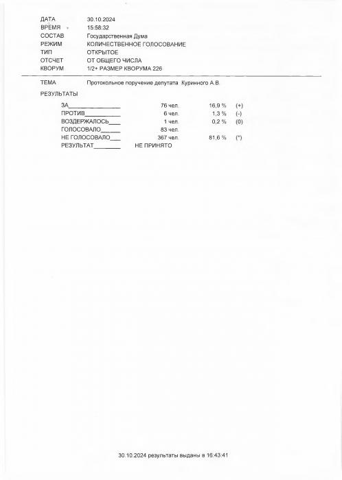 От Комитета Государственной Думы по безопасности и противодействию коррупции на пленарном заседании 30 октября по проекту протокольного поручения палате выступил представитель «Единой России» Э.А. Валеев. Вердикт представителя партии власти был краток: отклонить протокольное поручение и ничего не требовать от ФСБ,генпрокурора, правительства и Центробанка. Ни по вопросу возврата золотовалютных резервов, ни по украденным высокопоставленными «релокантами» бюджетным средствам, ни по требованию экстрадиции экс-премьера, экс-вице-премьеров и министров, сбежавших после начала СВО с государственными деньгами на Запад.
