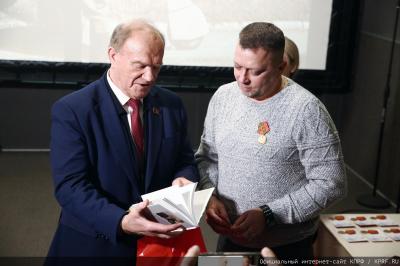 После осмотра музейных экспозиций в актовом зале состоялась церемония награждения пчеловодов - участников СВО памятными медалями ЦК КПРФ «80 лет Донбасской наступательной операции». Также Геннадий Зюганов вручил партийный билет заслуженному пчеловоду из Дагестана Мирзе Гасанову.