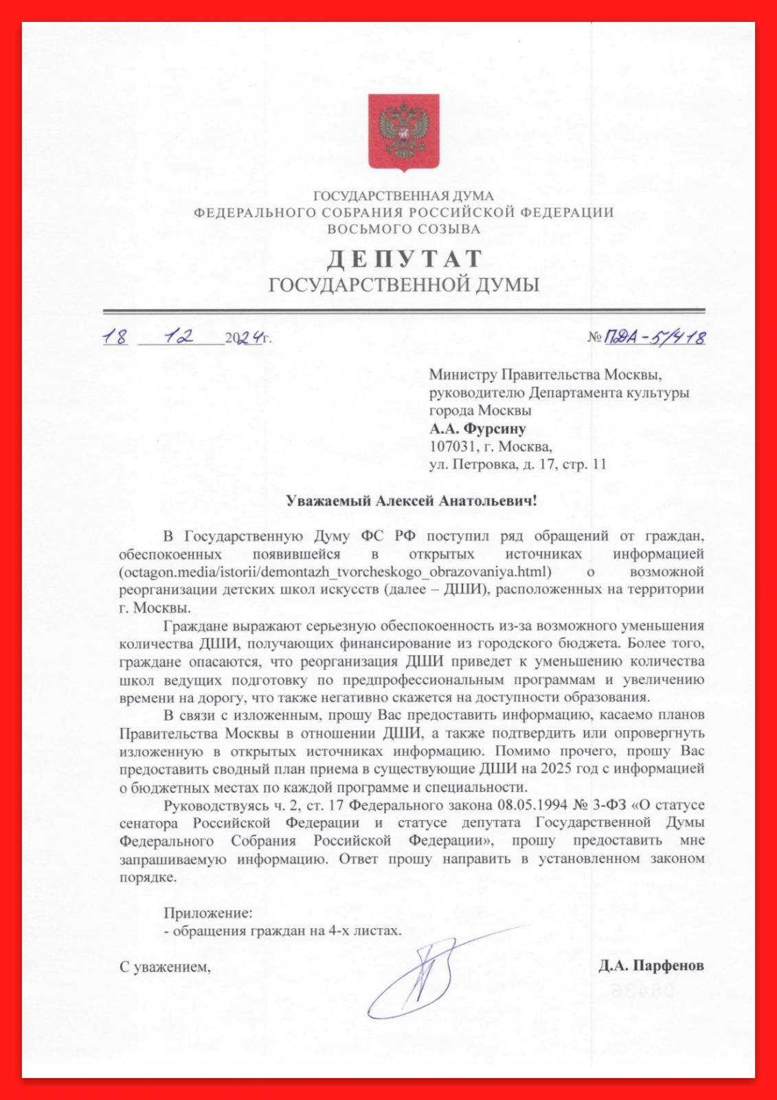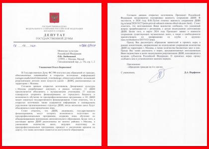 В связи с очевидной попыткой сокращения бесплатного образования в сфере культуры столицы по обращениям граждан, депутат Госдумы, секретарь МГК КПРФ Д.А. Парфенов направил два депутатских запроса: