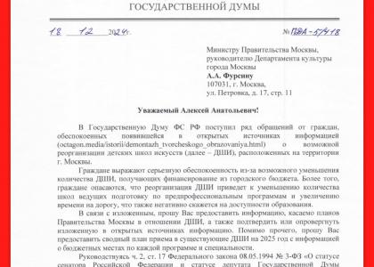 Министру Правительства Москвы, руководителю Департамента культуры города Москвы А.А. Фурсину — с требованием предоставить полные планы Правительства Москвы в отношении ДШИ, а также подтвердить или опровергнуть изложенную в открытых источниках информацию.