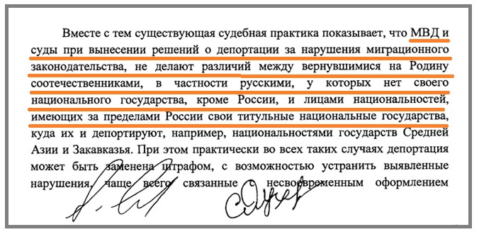 Но ситуации, когда из России депортируют русских, да ещё и многодетных, у которых здесь остаются семьи, неприемлемы. Это люди, которые волею судеб оказались в Средней Азии или Закавказье, но вернулись на историческую Родину, где оказались не нужны. Суды пачками высылают их обратно, даже живущих в России десятилетиями, — за любую бумажную ерунду.