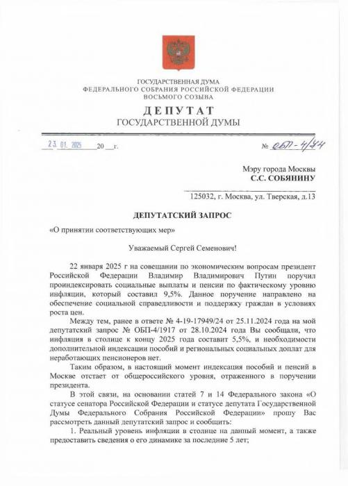 Примечательно, что ранее в своем ответе на мой депутатский запрос мэр Москвы аргументировал такую низкую индексацию - уровнем инфляции в столице.