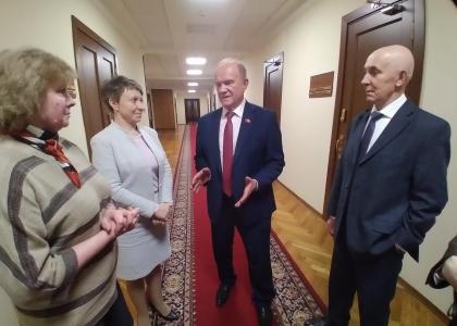 29 января в холле фракции КПРФ состоялась встреча Г.А.Зюганова, Ю.П.Синельщикова с педагогами и учащимися средней общеобразовательной школы № 9 города Алексина Тульской области