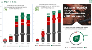 Особенно важно отметить фермерское хозяйство, которое становится стратегическим звеном в агропромышленном комплексе. Как видно на четвёртом слайде, фермеры сегодня обрабатывают почти 32% всех посевных площадей, что подтверждает их ключевую роль в обеспечении продовольственной безопасности страны. Я провёл детальный анализ по растениеводству и животноводству. В растениеводстве фермерские хозяйства занимают 21%, а в животноводстве – всего 6%. В среднем, их вклад в общий объём валовой продукции с/х товаров составляет порядка 15%, это говорит, какие у нас с вами резервы? Сегодня фермерские хозяйства обрабатывают 32% посевных площадей, но обеспечивают лишь 15% валовой продукции. Это означает, что у нас есть значительный потенциал для роста. Нам предстоит серьёзно работать над повышением эффективности, увеличением урожайности и продуктивности. Эти вопросы требуют нашего особого внимания.