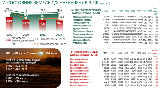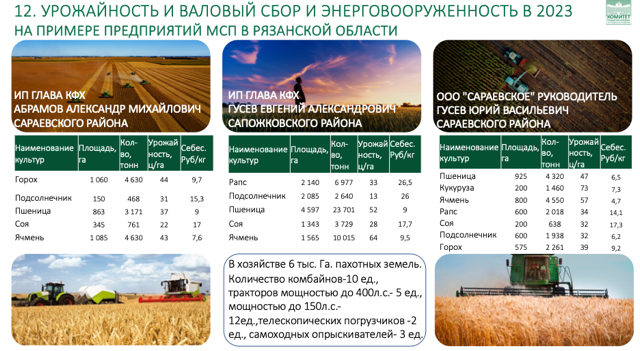 Уже есть примеры, которые доказывают: при правильном финансировании государственных программ, справедливой ценовой политике и грамотной интеграции технологий аграрный сектор способен выйти на новый уровень эффективности. Вот я хочу показать, допустим результаты работы рязанского фермера Александра Абрамова имеет, урожайность по зернобобовым на уровне 44 ц/га, это в рязанской области. Или, вот братья Гусевы стабильно получает до 50 000 тонн зернобобовых при урожайность на уровне 50 ц/га, демонстрируя, что при правильном подходе можно достигать значительных валовых сборов. Эти примеры доказывают, что российское фермерство обладает огромным потенциалом, который можно раскрыть, устраняя институциональные проблемы и создавая благоприятные условия для аграриев.