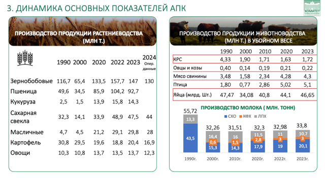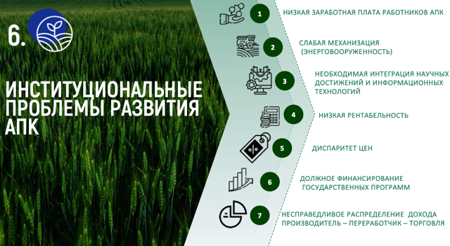 Если нам удастся устранить ключевые институциональные проблемы, такие как низкая заработная плата работников АПК, слабая механизация и недостаточная энерговооружённость, нехватка интеграции научных достижений и информационных технологий, а также низкая рентабельность, ценовой диспаритет и несправедливое распределение доходов между производителем, переработчиком и торговлей, то результат будет совершенно иным.