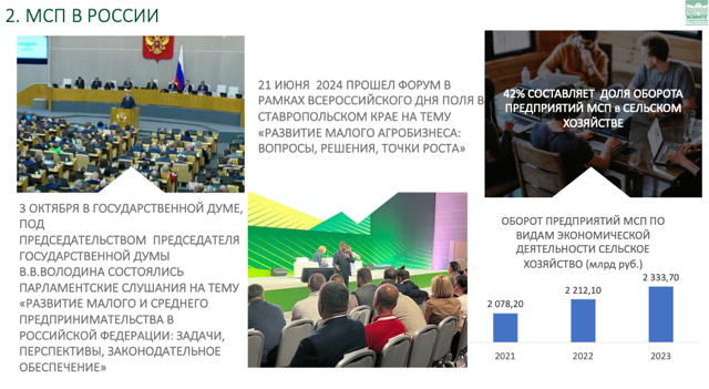 Государственная Дума уделяет особое внимание развитию малого бизнеса, в 2023 году вопрос развития МСП рассматривался на пленарном заседании под председательством В.В. Володина и были подведены итоги работы не только в агропромышленном комплексе, но и в других секторах экономики. Малый и средний бизнес играет значимую роль в экономике страны, обеспечивая 42% оборота производимой продукции если брать сельское хозяйство.