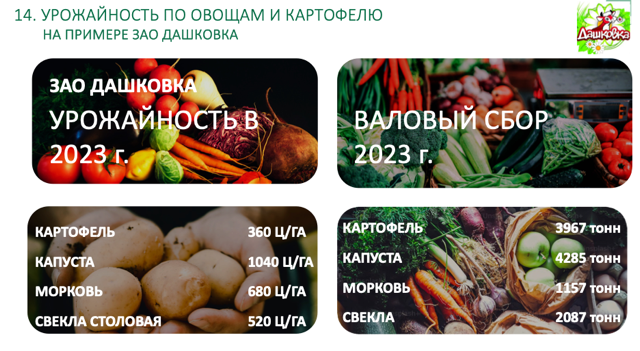 Если обратить внимание на одно из ведущих сельхозпредприятий Московской области – ЗАО «Дашковка», можно увидеть впечатляющие результаты: урожайность капусты достигает 1000 центнеров с гектара, картофеля – 360 центнеров. Это показатель того, что коллективы среднего масштаба, при грамотном управлении и применении современных технологий, могут демонстрировать высокий уровень производительности сопоставимый с крупными агрохолдингами. Эти данные ещё раз подтверждают, что при устранении институциональных проблем и создании благоприятных условий аграрии способны добиваться выдающихся результатов.